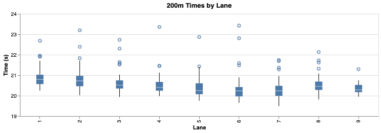 It’s clear from this data that runners in outside lanes are, on average, faster than those on the inside. However, this data is biased: the Diamond League gives the fastest sprinters their preferred lanes to (hopefully) produce faster times. Since sprinters are likely to prefer middle or outer lanes, we are likely overestimating the actual effect size.