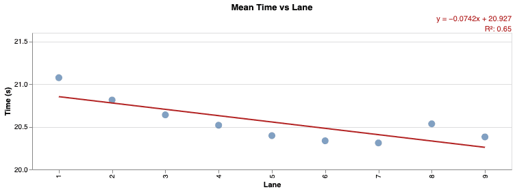 Note that this data is corrected for wind, using the quadratic model from this paper. A simple linear regression finds a difference of 0.07 seconds per lane: