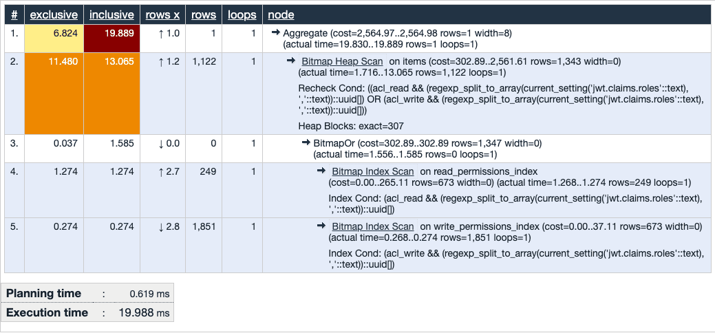It seems like the best approach may be the last one: an ACL table with a couple stored functions to help the query planner. It gives us the advantages of an ACL table (data tables don’t have metadata on them, ACL data is normalized) without the fairly large performance hits that the other methods have.