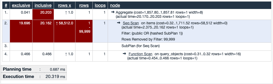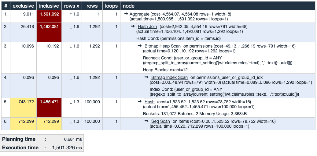 Carl from MemSQL proposed this architecture and claimed better performance because the query optimizer could “build a set of the object ids for the current array of subjects and leverage that during query execution.” Instead of querying across the entire permissions table in each RLS check, we can define a function query_objects(subjects, action) that returns the set of authorized items a list of subjects has access to: