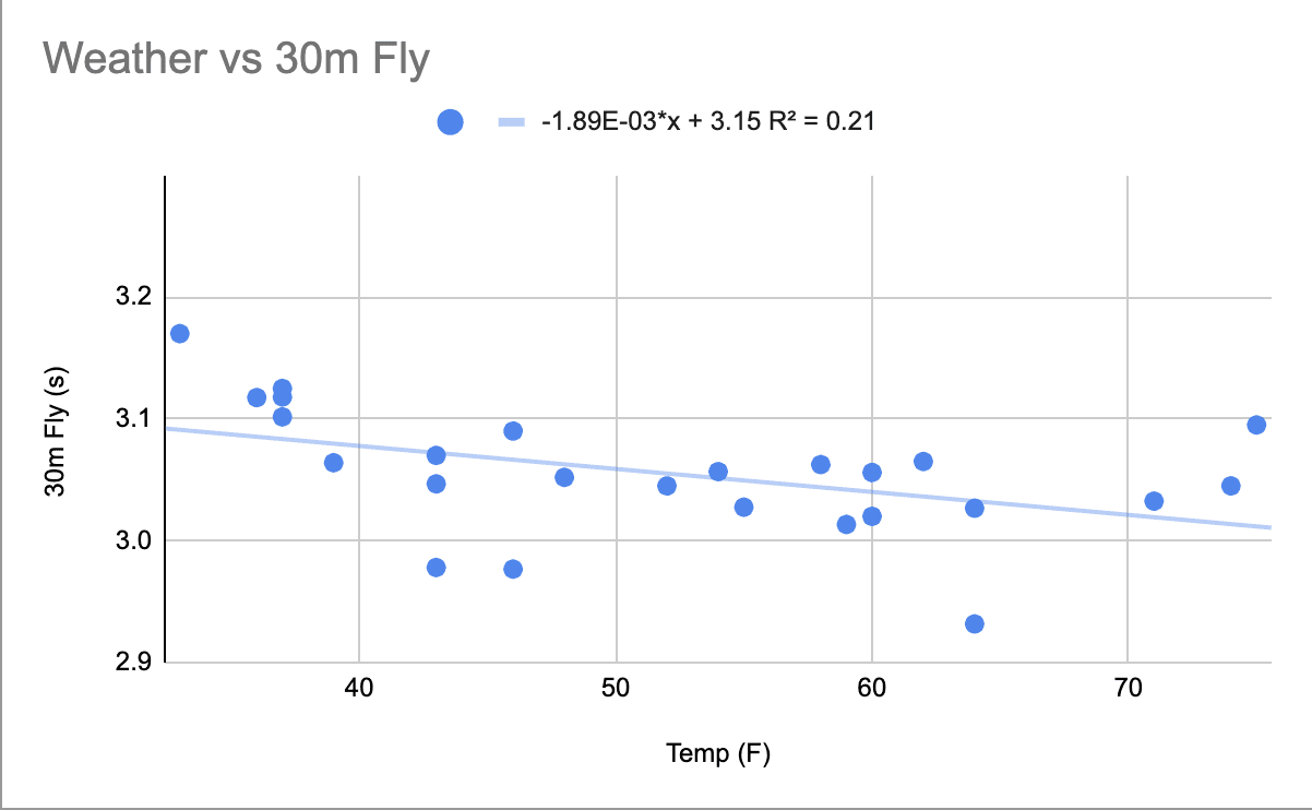 As temperatures decreased going into the winter, I noticed that my fly times were slowing down, despite breaking a sweat with each warmup. But my times weren’t always slower. I noticed that when the days were unseasonably warm (thanks California) or when I had a chance to run later in the day, I was consistently running faster and even setting PRs. This reminded me of my old March woes. Since I had all of my fly times over several months, I graphed my average fly time per workout against temperature and found a fairly strong correlation (r^2=0.21):